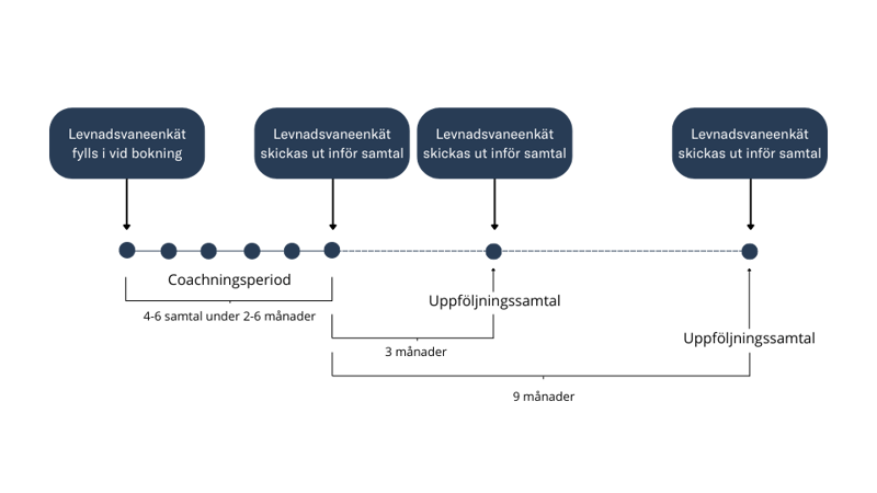 Formulär är ett viktigt stöd i arbetet med klienten, för att samla in information och mäta utvecklingen över tid. Som klient hos Hälsocoach online får du en uppföljning tre månader efter coachningsperioden avslutats och ytterligare en efter nio månader, för att se om de nya levnadsvanorna håller i sig. Klienten får alltid fylla i minst fyra formulär; det första inför det första besöket och det sista vid sista uppföljningen. Genom levnadsvaneenkäten som skickas ut inför samtalen och uppföljningssamtalet mäter man upplevd hälsa, rök- och snusvanor, aktivitetsminuter, kostindex samt Audit-C vid dessa tillfällen.